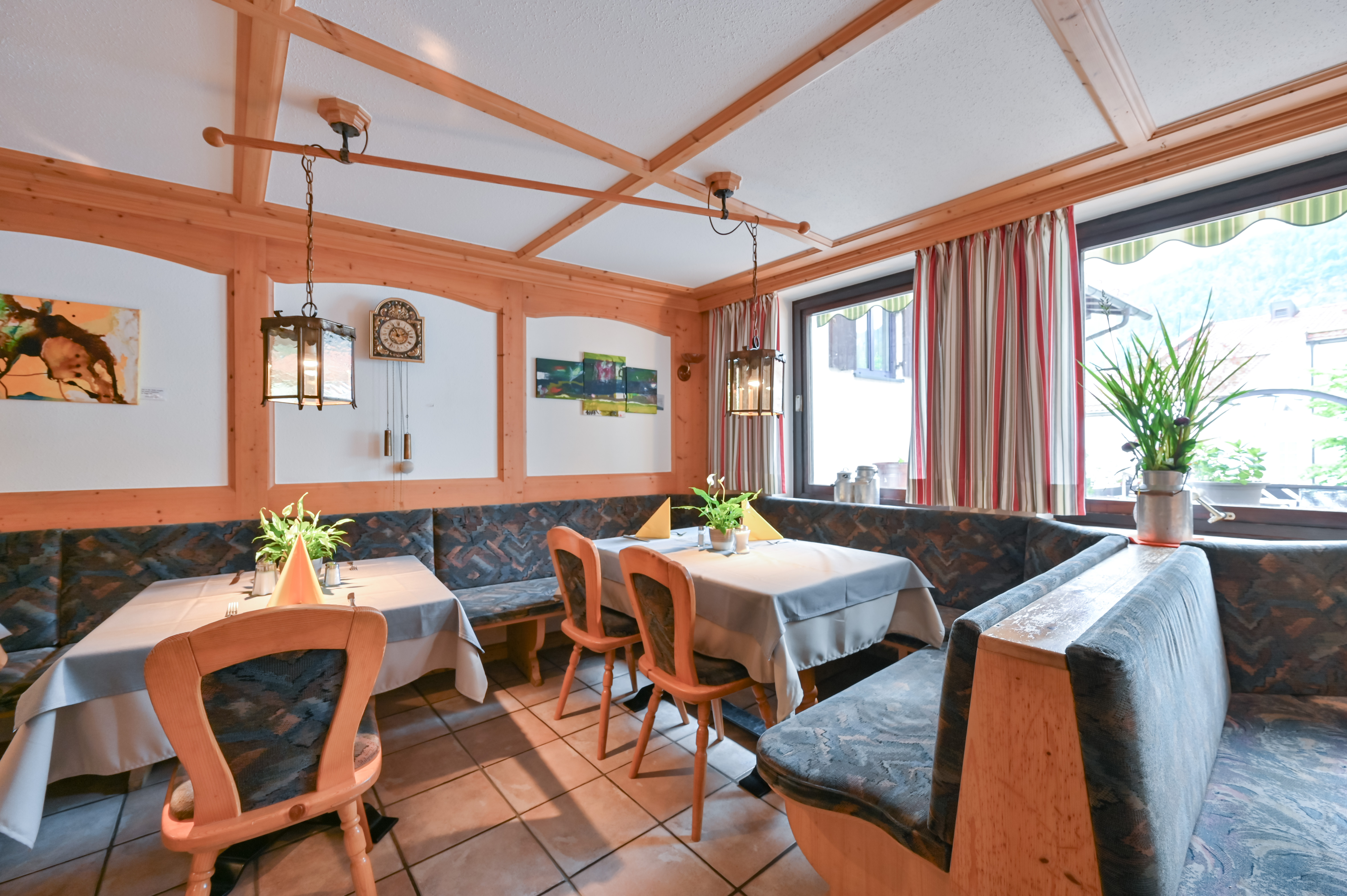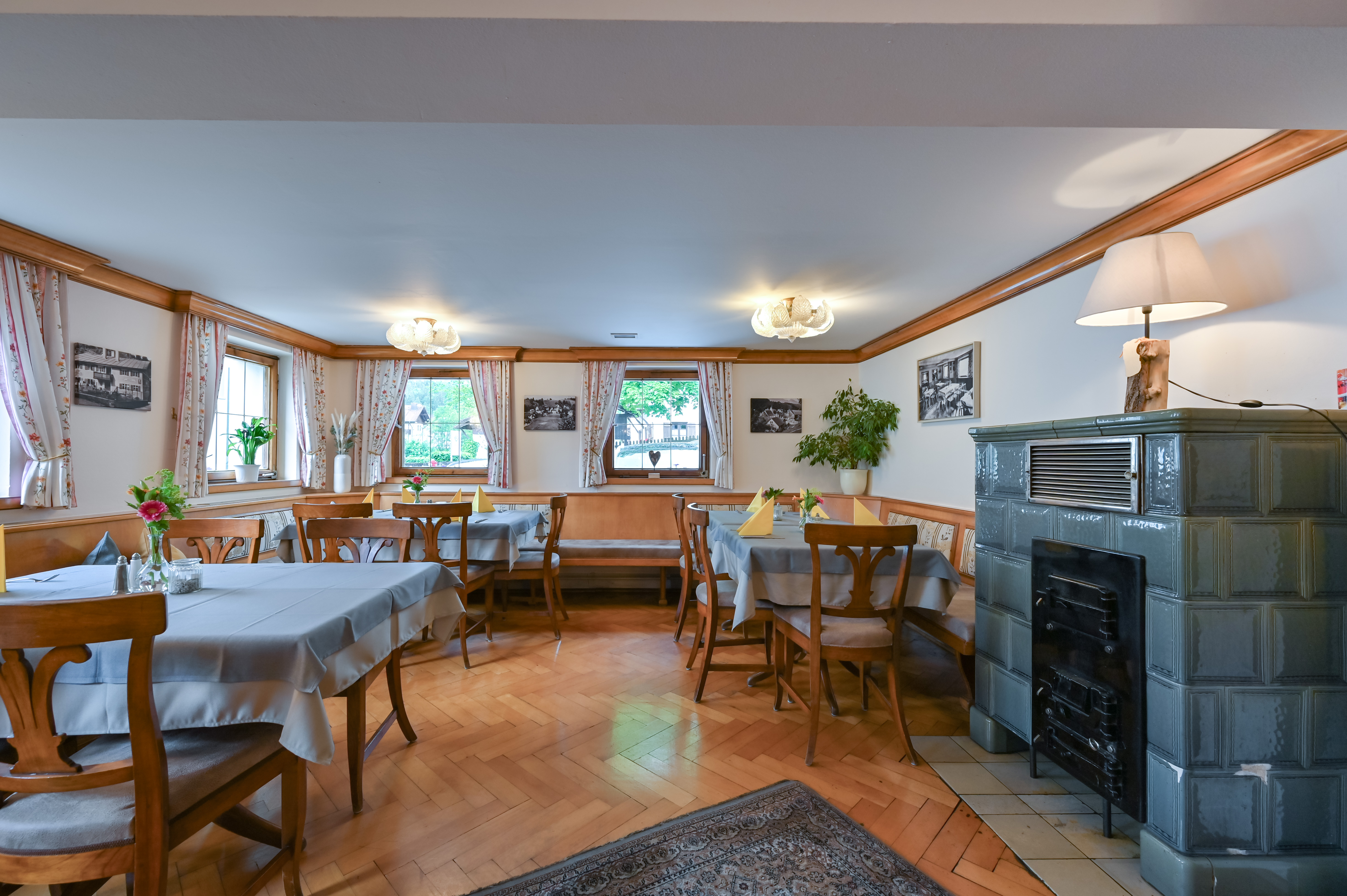 Der Frühlingsgarten ist ein Ort zum Wohlfühlen. Antike Accessoires, frische Blumen und der warme Schein des Kachelofens schaffen eine Atmosphäre, die Geborgenheit ausstrahlt. Im Sommer lädt unsere romantische Terrasse mit Blick ins Grüne zum Genießen und Verweilen ein.